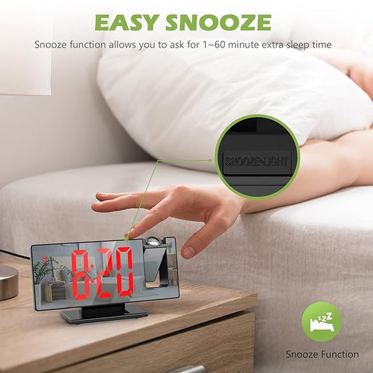 LED Mirror Projection Alarm Clock, 180° Projector, 7.8” Digital Display, Adjustable Brightness, Temp & Humidity, Snooze Function